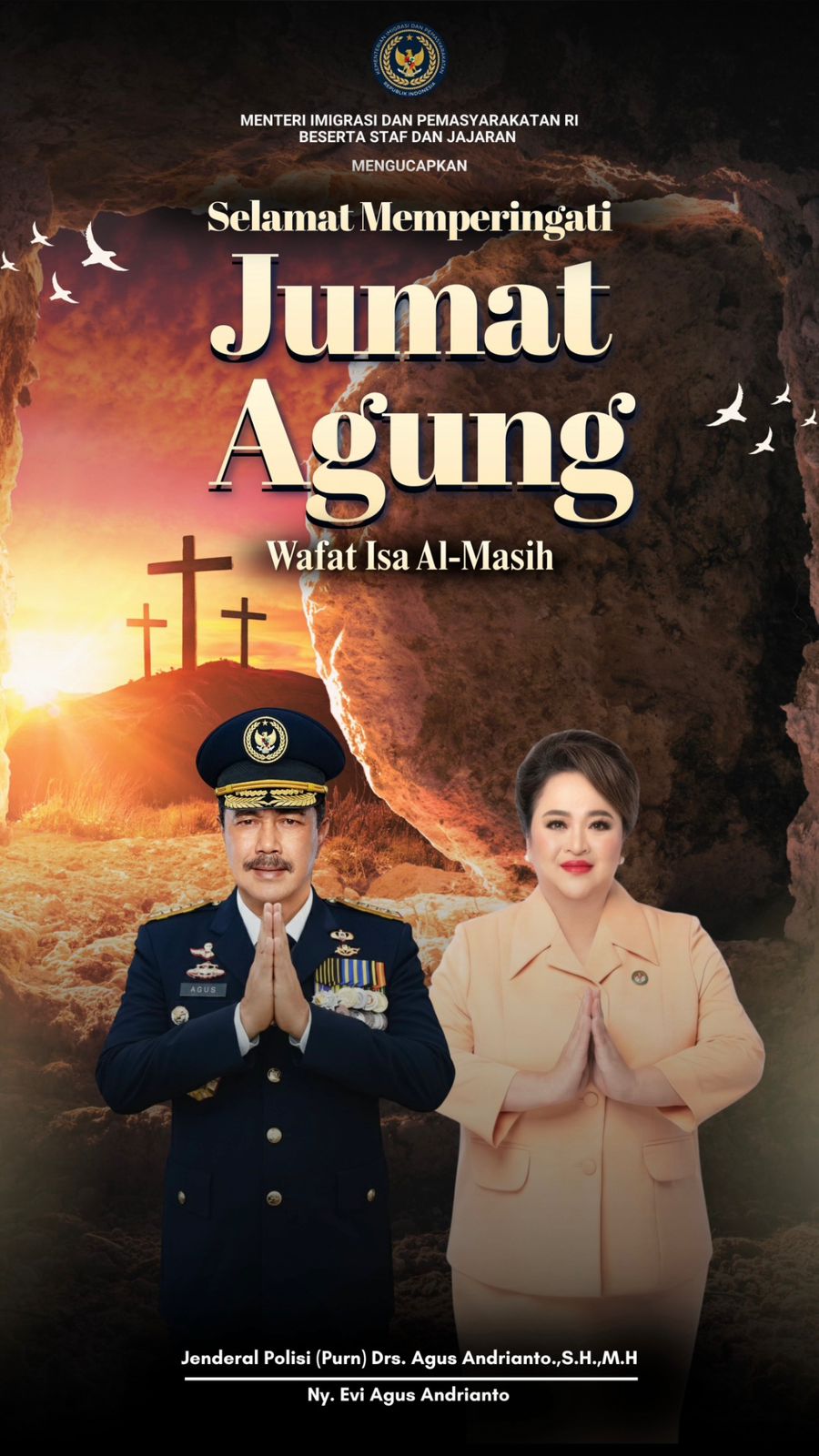 JAKARTA, 03 APRIL 2026 – Menteri Imigrasi dan Permasyarakatan Jenderal Pol (Pur) Agus Adrianto, S.H, M.H, bersama dengan jajaran seluruh anggota dan pegawai di lingkungan Kementerian Imigrasi dan Permasyarakatan, mengucapkan selamat Hari Besar Jumat Agung kepada seluruh umat Kristiani di Indonesia.