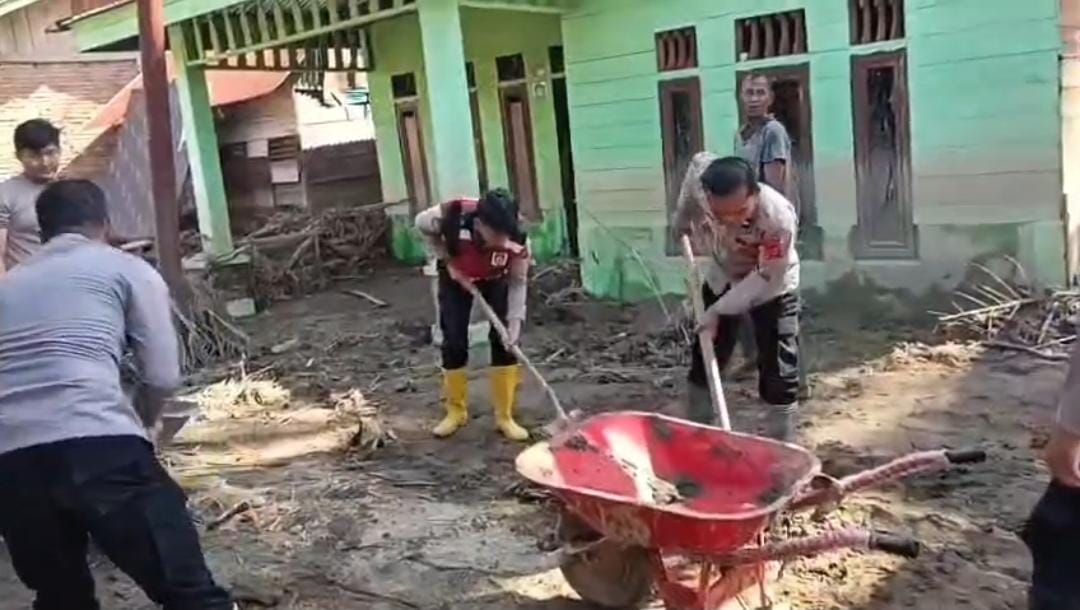 Banjir bandang yang melanda wilayah tersebut meninggalkan endapan lumpur dan serpihan material di sejumlah titik. Personel Polri bersama masyarakat bergotong royong membersihkan bagian dalam rumah, halaman, hingga akses jalan desa yang tertutup material banjir.