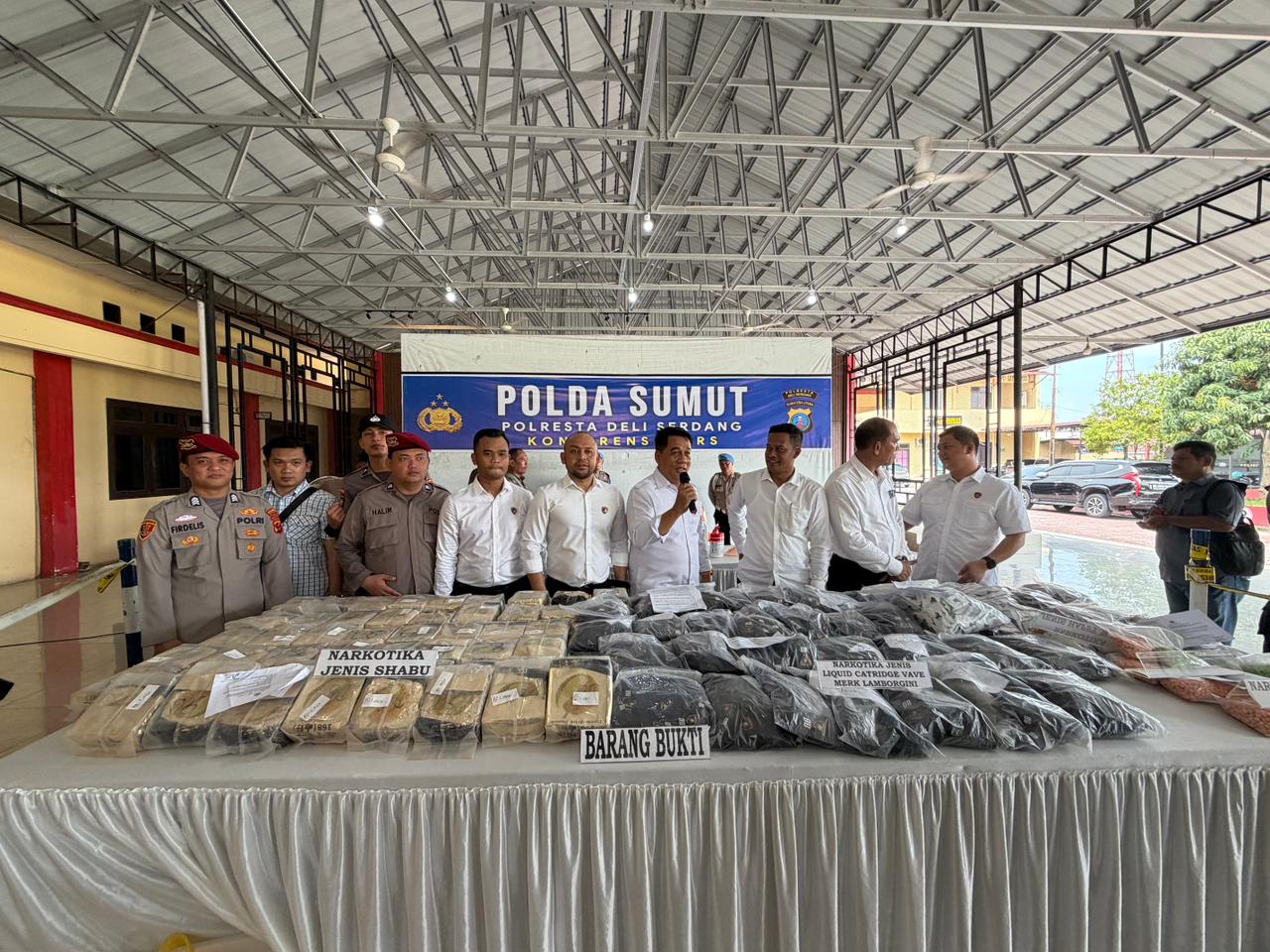 Pada saat penangkapan, tim menghadang kendaraan Toyota Avanza putih nomor polisi BK 1682 QR dan berhasil menangkap tiga tersangka, yaitu J Alias I (27 tahun, Tanjung Pura, Langkat), R (28 tahun, Tanjung Pura, Langkat), serta M Alias N (17 tahun, Tanjung Pura, Langkat) yang akan mendapatkan perlindungan sesuai peraturan hukum yang berlaku. Barang bukti yang disita meliputi 53.217,28 gram shabu dalam kemasan palsu durian kering, 3.249 buah cartridge liquid vape, 9.112 butir pil ekstasi merk Rolex, 350 sachet happy water, mobil yang digunakan, serta tiga unit handphone.